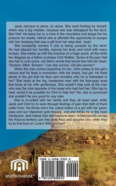 Janie Johnson is alone, so alone. She went hunting by herself, which was a big mistake, because she was kidnapped by the devil, Bart Holl. He takes her to a mine in the mountains and keeps her his prisoner for weeks, before she is afforded the opportunity to escape with her mustang that was a gift from her step-dad, Josef. She constantly worries if she is being pursued by the devil. He had abused her horribly, leaving her body and mind with many bruises. She meets up with the foreman of a huge ranch, all the while her disguise as a fellow confuses Clint Walker. Some of the pain that she has to over come, are Bart's words that struck fear into her heart, "Scream, Bitch. Scream." Can she survive, will she survive? When the man comes searching for her, Clint comes to the girl's rescue and he feels a connection with the lonely, lost girl. He finds plenty in the girl that he likes and wonders why he is interested in her? She looks at the big, handsome man with the blue-gray eyes that looks at her with gentleness. She couldn't help look at the man who was the total opposite of the beast who had hurt her. She has to heal, would it be possible for Clint to help her? No, she is convinced she wouldn't be any good for any man. She is re-united with her family and they all head west, while Janie and Clint try to work through feelings of pain that both of them suffer from. He thinks she's the cutest button of a girl with her green eyes and sun bleached gold tresses, and she thinks he is the most handsome, dark haired man she had ever seen. In their travels across the Arizona territory can they both heal and become one, while they try to find love on Love's Wild Journey?