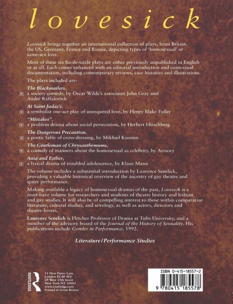 This volume makes available an international collection of plays, from Britain, the US, Germany, France and Russia, providing an essential and fascinating resource for anyone interested in the theatre culture of this period. Lovesick brings together six plays, each with individual introductions, including an author biography and a production history. The editor provides a contextual introduction to the volume offering valuable information about the ancestry of gay theatre and queer performance. The anthology reveals how 'sexual deviance' made its way into the drama of this time, and also how homosexual playwrights used comic or lyrical devices in order to celebrate a 'superior sensibility'.