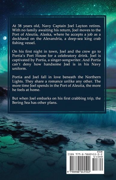 At 38 years old, Navy Captain Joel Layton retires. With no family awaiting his return, Joel moves to the Port of Aleutia, Alaska, where he accepts a job as a deckhand on the Alexandria, a deep-sea king crab fishing vessel. On his first night in town, Joel and the crew go to Portia's Port House for a celebratory drink. Joel is captivated by Portia, a singer-songwriter. And Portia can't deny how handsome Joel is in his Navy uniform. Portia and Joel fall in love beneath the Northern Lights. They share a romance unlike any other. The more time Joel spends in the Port of Aleutia, the more he feels at home. But when Joel embarks on his first crabbing trip, the Bering Sea has other plans.