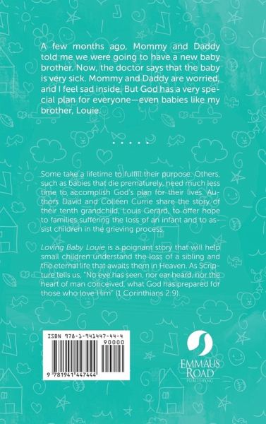 Some take a lifetime to fulfill their purpose. Others, such as babies that die prematurely, need much less time to accomplish God's plan for their lives. Authors David and Colleen Currie share the story of their tenth grandchild, Louis Gerard, to offer hope to families suffering the loss of an infant and to assist children in the grieving process. Loving Baby Louie is a poignant story that will help small children understand the loss of a sibling and the eternal life that awaits them in Heaven. As Scripture tells us, "No eye has seen, nor ear heard, nor the heart of man conceived, what God has…mehr