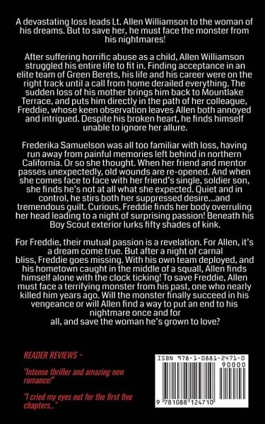 A devastating loss leads Lt. Allen Williamson to the woman of his dreams, but to save her, he must face the monster from his nightmares! After suffering horrific abuse as a child, Allen Williamson struggled his entire life to fit in. Finding acceptance in an elite team of Green Berets, his life and his career were on the right track until a call from home derailed everything. The sudden loss of his mother brings him back to Mountlake Terrace, and puts him directly in the path of her colleague, Freddie, whose keen observation leaves Allen both annoyed and intrigued. Despite his broken heart, he finds himself unable to ignore her allure. Frederika Samuelson was all too familiar with loss having run away from painful memories left behind in northern California. Or so she thought. When her friend and mentor passes unexpectedly, old wounds are re-opened. And when she comes face to face with her friend's single, soldier son, she finds he's not at all what she expected. Quiet and in control, he stirs both her suppressed desire...and tremendous guilt. Curious, Freddie finds her body overruling her head leading to a night of surprising passion! Beneath his Boy Scout exterior lurks fifty shades of kink. For Freddie, their mutual passion is a revelation. For Allen, it's a dream come true. But after a night of carnal bliss, Freddie goes missing. With his own team deployed, and his hometown caught in the middle of a squall, Allen finds himself alone with the clock ticking! To save Freddie, Allen must face a terrifying monster from his past, one who nearly killed him years ago. Will the monster finally succeed in his vengeance, or will Allen find a way to put an end to his nightmare once and for all, and save the woman he's grown to love?