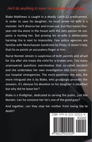 Blake Matthews is caught in a deadly Catch-22 predicament. In order to save his daughter, he must prove his wife is a monster. He'll divorce her and move out, but that leaves five-year-old Gia alone in the house with the very person he suspects is hurting her. But proving his ex-wife is deliberately harming Gia is next to impossible. Few police agencies are familiar with Munchausen Syndrome by Proxy. It doesn't help that his ex points an accusatory finger at him. Nurse Noreen Jensen is suspicious of both parents and afraid for Gia after she treats the child for a broken arm. Too many unanswered questions overshadow that so-called accident and she undertakes her own investigation into Gia's numerous hospital emergencies. The more questions she asks, the more intrigued she is by Blake, who grudgingly provides the answers. It's obvious his devotion to his daughter is steadfast but why did he leave her? Blake is a firefighter, dedicated to serving the public, just like Noreen. Can he convince her he's one of the good guys? And together, can they stop her mother from loving Gia to death?