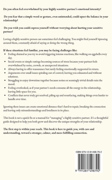 Do you often feel overwhelmed by your highly sensitive partner's emotional intensity? Do you fear that a simple word or gesture, even unintended, could upset the balance in your relationship? Do you wish you could express yourself without worrying about hurting your sensitive partner? Loving a highly sensitive person can sometimes feel challenging. You might find yourself tiptoeing around them, constantly afraid of saying or doing the wrong thing. In trying to protect them, you may even realize that you're neglecting your own needs. You might wonder if there's a way to build a more balanced relationship where you both feel supported and valued. When these difficulties pile up, the relationship can become a burden, with arguments that escalate and misunderstandings that turn into seemingly insurmountable barriers. If these situations feel familiar, you may be facing challenges like:Feeling drained as you try to avoid triggering intense reactions, like walking on eggshells every day. Social events or simple outings becoming sources of stress because your partner feels overwhelmed by noise, crowds, or unexpected situations. Always having to offer reassurance but rarely feeling emotionally supported in return. Arguments over small issues spiraling out of control, leaving you exhausted and without solutions. Struggling to enjoy downtime together because noises or seemingly trivial details ruin the mood. Feeling overlooked, as if your partner's needs consume all the energy in the relationship, leaving little space for you. Conflicts that never truly get resolved, piling up and resurfacing, making things even harder to handle over time. Ignoring these issues can create emotional distance that's hard to repair, breaking the connection and leaving only misunderstandings and loneliness in its place. This book is not a quick fix or a manual for "managing" a highly sensitive partner. It's a thoughtful guide designed to help you both grow and discover the unique strengths of your relationship. It will provide you with practical tools to improve communication, handle difficult moments without feeling overwhelmed, and build a balance that takes both of your needs into account. Your partner's sensitivity is not a barrier-it's a gift. With the right approach, you can turn misunderstandings into opportunities to strengthen your bond, without losing yourself in the process. You can be true to who you are and love deeply, creating a relationship that enriches you both. The first step is within your reach. This book is here to guide you, with care and understanding, toward a stronger, calmer, and more fulfilling connection.