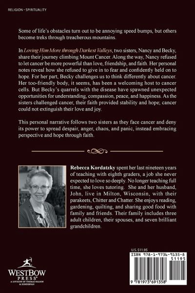 Some of life's obstacles turn out to be annoying speed bumps, but others become treks through treacherous mountains. In Loving Him More through Darkest Valleys, two sisters, Nancy and Becky, share their journey climbing Mount Cancer. Along the way, Nancy refused to let cancer be more powerful than love, friendship, and faith. Her personal notes reveal how she refused to give in to fear and confidently held on to hope. For her part, Becky challenges us to think differently about cancer. Her too-friendly body, it seems, has been a welcoming host to cancer cells. But Becky's quarrels with the disease have spawned unexpected opportunities for understanding, compassion, peace, and happiness. As the sisters challenged cancer, their faith provided stability and hope; cancer could not extinguish their love and joy. This personal narrative follows two sisters as they face cancer and deny its power to spread despair, anger, chaos, and panic, instead embracing perspective and hope through faith.