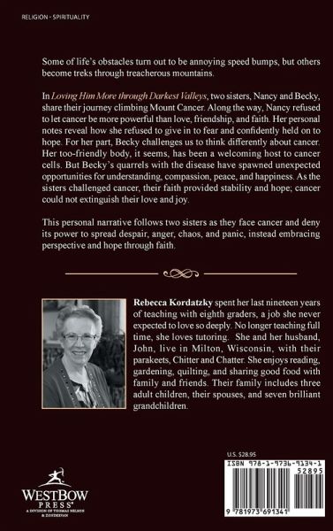 Some of life's obstacles turn out to be annoying speed bumps, but others become treks through treacherous mountains. In Loving Him More through Darkest Valleys, two sisters, Nancy and Becky, share their journey climbing Mount Cancer. Along the way, Nancy refused to let cancer be more powerful than love, friendship, and faith. Her personal notes reveal how she refused to give in to fear and confidently held on to hope. For her part, Becky challenges us to think differently about cancer. Her too-friendly body, it seems, has been a welcoming host to cancer cells. But Becky's quarrels with the disease have spawned unexpected opportunities for understanding, compassion, peace, and happiness. As the sisters challenged cancer, their faith provided stability and hope; cancer could not extinguish their love and joy. This personal narrative follows two sisters as they face cancer and deny its power to spread despair, anger, chaos, and panic, instead embracing perspective and hope through faith.