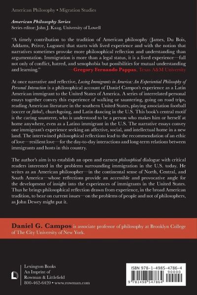 At once narrative and reflective, Loving Immigrants in America: An Experiential Philosophy of Personal Interaction is a philosophical account of Daniel Campos¿s experience as a Latin American immigrant to the United States of America. A series of interrelated personal essays together convey this experience of walking or sauntering, going on road trips, reading American literature in the southern United States, playing association football (soccer or fútbol), churchgoing, and Latin dancing in the U.S. This book's central motif is the caring saunterer, who is understood to be a person who makes him or herself at home anywhere, even as a Latino immigrant in the U.S. The narrative essays convey one immigrant's experience seeking an affective, social, and intellectual home in a new land. The intertwined philosophical reflections lead to the recommendation of an ethic of love-resilient love-for the day-to-day interactions and long-term relations between immigrants and hosts in this country. The author's aim is to establish an open and earnest philosophical dialogue with critical readers interested in the problems surrounding immigration in the U.S. today. He writes as an American philosopher-in the continental sense of North, Central, and South America-whose reflections provide an accessible and provocative angle for the development of insight into the experiences of immigrants in the United States. Thus he brings philosophical reflection drawn from experience, in the broad American tradition, to bear on current issues-on the problems of people and not of philosophers, as John Dewey might put it.
