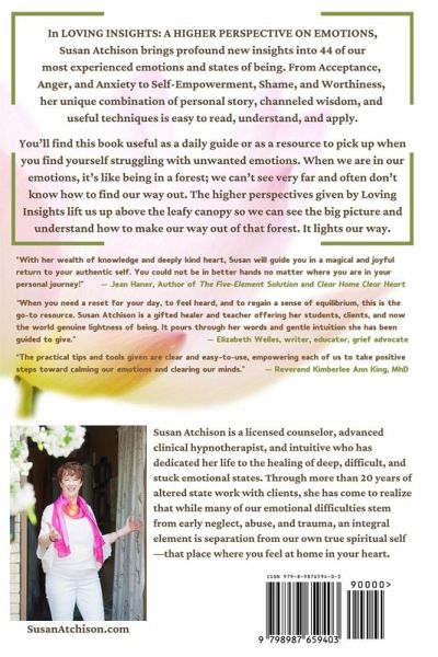 In LOVING INSIGHTS: A HIGHER PERSPECTIVE ON EMOTIONS, Susan Atchison brings profound new insights into 44 of our most experienced emotions and states of being. From Acceptance, Anger, and Anxiety to Self-Empowerment, Shame, and Worthiness, her unique combination of personal story, channeled wisdom, and useful techniques is easy to read, understand, and apply. You'll find this book useful as a daily guide or as a resource to pick up when you find yourself struggling with unwanted emotions. When we are in our emotions, it's like being in a forest; we can't see very far and often don't know how to find our way out. The higher perspectives given by Loving Insights lift us up above the leafy canopy so we can see the big picture and understand how to make our way out of that forest. It lights our way.