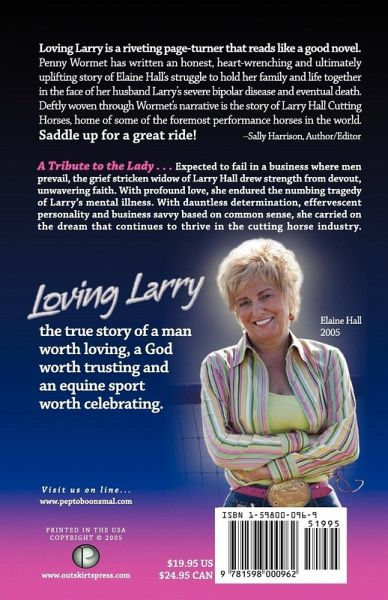 LOVING LARRY the true story of a man worth loving, a God worth trusting and an equine sport worth celebrating. Loving Larry is a riveting page-turner that reads like a good novel. Penny Wormet has written an honest, heart-wrenching and ultimately uplifting story of Elaine Hall's struggle to hold her family and life together in the face of her husband Larry's severe bipolar disease and eventual death. Deftly woven through Wormet's narrative is the story of Larry Hall Cutting Horses, home of some of the foremost performance horses in the world. Saddle up for a great ride! ~Sally Harrison, Author/Editor A Tribute to the Lady . . . Expected to fail in a business where men prevail, the grief stricken widow of Larry Hall drew strength from devout, unwavering faith. With profound love, she endured the numbing tragedy of Larry's mental illness. With dauntless determination, effervescent personality and business savvy based on common sense, she carried on the dream that continues to thrive in the cutting horse industry.