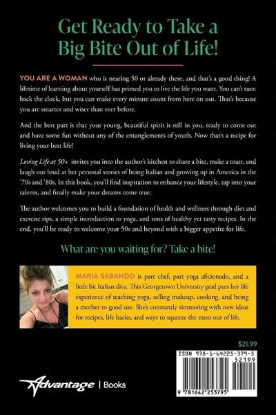 Get Ready to Take a Big Bite Out of Life! YOU ARE A WOMAN who is nearing 50 or already there, and that's a good thing! A lifetime of learning about yourself has primed you to live the life you want. You can't turn back the clock, but you can make every minute count from here on out. That's because you are smarter and wiser than ever before. And the best part is that your young, beautiful spirit is still in you, ready to come out and have some fun without any of the entanglements of youth. Now that's a recipe for living your best life! Loving Life at 50+ invites you into the author's kitchen to share a bite, make a toast, and laugh out loud at her personal stories of being Italian and growing up in America in the 70s and 80s. In this book, you'll find inspiration to enhance your lifestyle, tap into your talents, and finally make your dreams come true. The author welcomes you to build a foundation of health and wellness through diet and exercise tips, a simple introduction to yoga, and tons of healthy yet tasty recipes. In the end, you'll be ready to welcome your 50s and beyond with a bigger appetite for life. What are you waiting for? Take a bite!