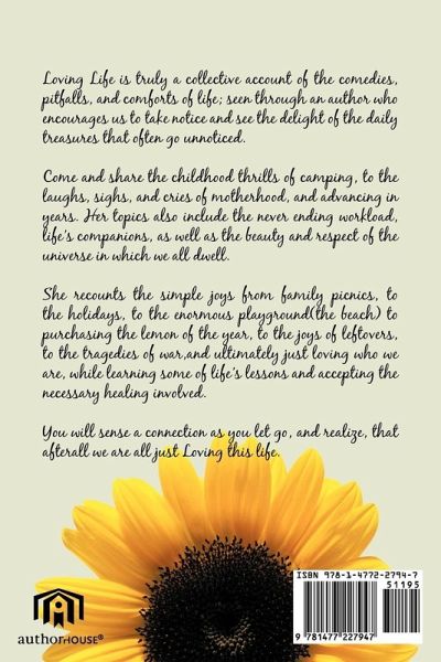 Loving Life is truly a collective account of the comedies, pitfalls, and comforts of life; seen through an author who encourages us to take notice and see the delight of the daily treasures that often go unnoticed. Come and share the childhood thrills of camping, to the laughs, sighs, and cries of motherhood, and advancing in years. Her topics also include the never ending workload, life's companions, as well as the beauty and respect of the universe in which we all dwell. She recounts the simple joys from family picnics, to the holidays, to the enormous playground(the beach) to purchasing the lemon of the year, to the joys of leftovers, to the tragedies of war,and ultimately just loving who we are, while learning some of life's lessons and accepting the necessary healing involved. You will sense a connection as you let go, and realize, that afterall we are all just Loving this life.