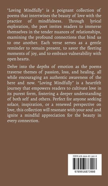 "Loving Mindfully" is a poignant collection of poems that intertwines the beauty of love with the practice of mindfulness. Through lyrical exploration, the poet invites readers to immerse themselves in the tender nuances of relationships, examining the profound connections that bind us to one another. Each verse serves as a gentle reminder to remain present, to savor the fleeting moments of joy, and to embrace vulnerability with open hearts. Delve into the depths of emotion as the poems traverse themes of passion, loss, and healing, all while encouraging an authentic awareness of the here and now. "Loving Mindfully" is a heartfelt journey that empowers readers to cultivate love in its purest form, fostering a deeper understanding of both self and others. Perfect for anyone seeking solace, inspiration, or a renewed perspective on love, this collection will resonate with your soul and ignite a mindful appreciation for the beauty in every connection.