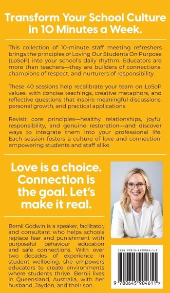 LOSOP Momentum: Staffroom Edition Weekly refreshers for building lasting connection in education. Transform your school culture in 10 minutes a week: This collection of weekly staff meeting refreshers brings the principles of Loving Our Students On Purpose (LoSoP) into your school's daily rhythm. Educators are more than teachers-they are builders of connections, champions of respect, and nurturers of responsibility. These 40 sessions will help recalibrate your team on LoSoP values, with concise teachings, creative metaphors, and reflective questions that inspire meaningful discussions, personal growth, and practical applications. Revisit core principles-healthy relationships, joyful responsibility, and genuine restoration-and discover ways to integrate them into your professional life. Each session fosters a culture of love and connection, empowering students and staff alike.