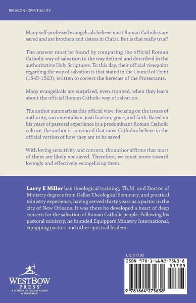 Many self-professed evangelicals believe most Roman Catholics are saved and are brothers and sisters in Christ. But is that really true? The answer must be found by comparing the official Roman Catholic way of salvation to the way defined and described in the authoritative Holy Scriptures. To this day, their official viewpoint regarding the way of salvation is that stated in the Council of Trent (1545-1563), written to correct the heresies of the Protestants. Many evangelicals are surprised, even stunned, when they learn about the official Roman Catholic way of salvation. The author summarizes this official view, focusing on the issues of authority, sacramentalism, justification, grace, and faith. Based on his years of pastoral experience in a predominant Roman Catholic culture, the author is convinced that most Catholics believe in the official version of how they are to be saved. With loving sensitivity and concern, the author affirms that most of them are likely not saved. Therefore, we must move toward lovingly and effectively evangelizing them.