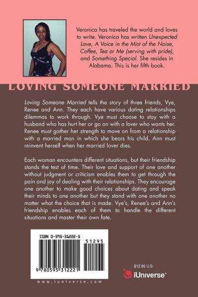 Loving Someone Married tells the story of three friends, Vye, Renee and Ann. They each have various dating relationships dilemmas to work through. Vye must choose to stay with a husband who has hurt her or go on with a lover who wants her. Renee must gather her strength to move on from a relationship with a married man in which she bears his child. Ann must reinvent herself when her married lover dies. Each woman encounters different situations, but their friendship stands the test of time. Their love and support of one another without judgment or criticism enables them to get through the pain and joy of dealing with their relationships. They encourage one another to make good choices about dating and speak their minds to one another but they stand with one another no matter what the choice that is made. Vye's, Renee's and Ann's friendship enables each of them to handle the different situations and master their own fate.
