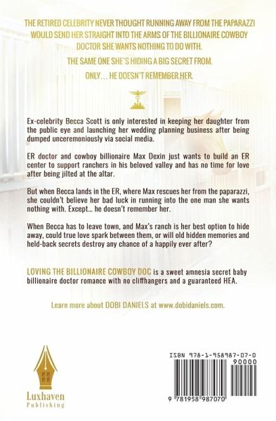 The retired celebrity never thought running away from the paparazzi would send her straight into the arms of the billionaire cowboy doctor she wants nothing to do with. The same one she's hiding a big secret from. Only... he doesn't remember her. Ex-celebrity Becca Scott is only interested in keeping her daughter from the public eye and launching her wedding planning business after being dumped unceremoniously via social media. ER doctor and cowboy billionaire Max Dexin just wants to build an ER center to support ranchers in his beloved valley and has no time for love after being jilted at the altar. But when Becca lands in the ER, where Max rescues her from the paparazzi, she couldn't believe her bad luck in running into the one man she wants nothing with. Except... he doesn't remember her. When Becca has to leave town, and Max's ranch is her best option to hide away, could true love spark between them, or will old hidden memories and held-back secrets destroy any chance of a happily ever after? LOVING THE BILLIONAIRE COWBOY DOC, a sweet amnesia secret baby billionaire doctor romance, is the fifth book in the Dexington Doctor Billionaires series. Author's Warning: This amnesia secret baby later-in-life romance will tug at your heart and reassure you that love is still possible at different stages in life. Side effects can occur if you're allergic to all-the-feels, strong heroines, and swoon-worthy doctor heroes. Books in the Dexington Doctor Billionaires series:Loving the Billionaire Heir Doc Loving the Billionaire Owner Doc Loving the Billionaire Army Doc Loving the Billionaire Boss Doc Loving the Billionaire Cowboy Doc Books in the Dexington Christmas Billionaires series:A Billionaire Inventor for Christmas A Billionaire Butler for Christmas A Billionaire Dentist for Christmas Books in A Cowboy Loves the Doctor series:A Doctor Second Chance for the Cowboy (prequel) A Doctor Blind Date for the Cowboy A Doctor Enemy for the Cowboy A Doctor Billionaire for the Cowboy