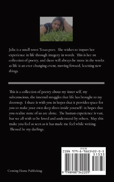 This is a collection of poetry about the soul, the subconscious, the things we do not wish to face but we must in order to grow- to become more of what we truly are inside. May it give you space to search your inner world. May it reintroduce you to the dragons and monsters you have buried, and may it give you the courage to befriend them instead of keeping them caged away. You are beautiful and all the parts of you are necessary and loved. Blessed Be my Darling.