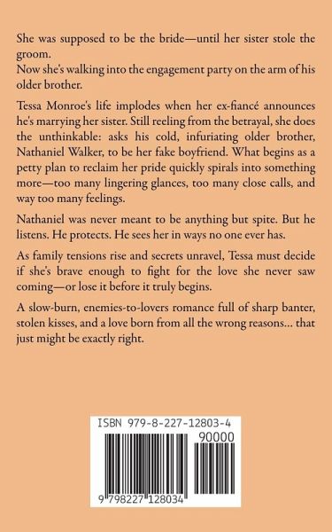 She was supposed to be the bride-until her sister stole the groom. Now she's walking into the engagement party on the arm of his older brother. Tessa Monroe's life implodes when her ex-fiancé announces he's marrying her sister. Still reeling from the betrayal, she does the unthinkable: asks his cold, infuriating older brother, Nathaniel Walker, to be her fake boyfriend. What begins as a petty plan to reclaim her pride quickly spirals into something more-too many lingering glances, too many close calls, and way too many feelings. Nathaniel was never meant to be anything but spite. But he listens. He protects. He sees her in ways no one ever has. As family tensions rise and secrets unravel, Tessa must decide if she's brave enough to fight for the love she never saw coming-or lose it before it truly begins. A slow-burn, enemies-to-lovers romance full of sharp banter, stolen kisses, and a love born from all the wrong reasons... that just might be exactly right.
