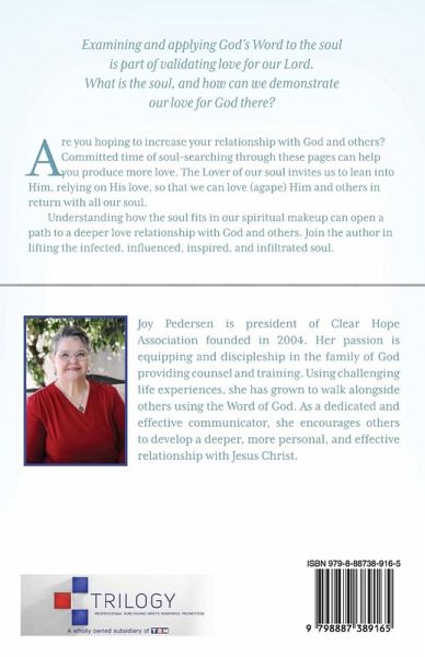 Examining and applying God's Word to the soul is part of validating love for our Lord. What is the soul, and how can we demonstrate our love for God there? Are you hoping to increase your relationship with God and others? Committed time of soul-searching through these pages can help you produce more love. The Lover of our soul invites us to lean into Him, relying on His love, so that we can love (agape) Him and others in return with all our soul. Understanding how the soul fits in our spiritual makeup can open a path to a deeper love relationship with God and others. Join the author in lifting the infected, influenced, inspired, and infiltrated soul.