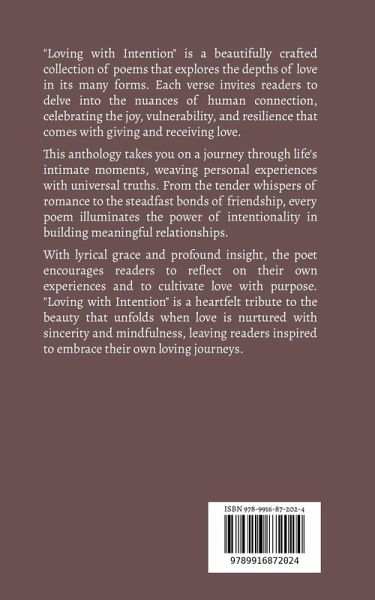 "Loving with Intention" is a beautifully crafted collection of poems that explores the depths of love in its many forms. Each verse invites readers to delve into the nuances of human connection, celebrating the joy, vulnerability, and resilience that comes with giving and receiving love. This anthology takes you on a journey through life's intimate moments, weaving personal experiences with universal truths. From the tender whispers of romance to the steadfast bonds of friendship, every poem illuminates the power of intentionality in building meaningful relationships. With lyrical grace and profound insight, the poet encourages readers to reflect on their own experiences and to cultivate love with purpose. "Loving with Intention" is a heartfelt tribute to the beauty that unfolds when love is nurtured with sincerity and mindfulness, leaving readers inspired to embrace their own loving journeys.