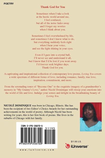 Thank God for You Sometimes when I take a look at the hectic world around me, I feel confused, but all of the noise fades away and I forget my worries when I think about you. Sometimes I feel overwhelmed by life, and sometimes I don't know what to do, but everything suddenly feels right when I hear your voice, and see the light shining in your eyes. Even if I gaze into a crystal ball, I'll never see and understand it all, but I know that I'd be lost if you went away. I'd forever seek brighter days. Thank God for you. A captivating and inspirational collection of contemporary love poems, Loving You covers a wide spectrum of different forms of love, including romance, family, true love, inspiration, commitment, and more. From the serenading tones of 'Become One" to the exquisite imagery of a grandmother's memory in 'My Granny's Love," author Nicolé Dominique will sweep your emotions into the world of life and love. Indulge your senses and delight in the breathtaking beauty of Loving You.