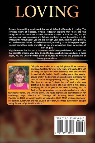Success is something we all want, but we all define it differently. In Loving: The Mystical Heart of Success, Virginia Ridgeway explains that there are two categories of success: inner success and outer success. In four sections, you will examine your past successes and failures and learn to see the positive in it all. Through the "PlayPages", you will dig through your past, examine your present, and envision your future. Visualizations and journaling prompts help you forgive yourself and others easily and often so you are not weighed down by burdens of hurt or guilt. Virginia reveals that the secret to any success is Loving and shows you how to use that secret to improve your daily life and find success both inside and out. In these pages, you will unite the three parts of yourself to work for the greatest life of Loving you can have.