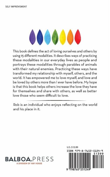 This book defines the act of loving ourselves and others by using 15 different modalities. It describes ways of practicing these modalities in our everyday lives as people and portrays these modalities through parables of animals with their natural enemies. Practicing these ways have transformed my relationship with myself, others, and the world. It has empowered me to love myself, and love and be loved by others more than I ever have before. My hope is that this book helps others increase the love they have for themselves and share with others, as well as better love those who seem difficult to love.