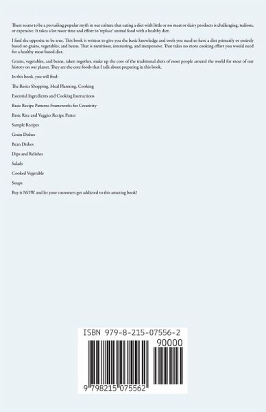 There seems to be a prevailing popular myth in our culture that eating a diet with little or no meat or dairy products is challenging, tedious, or expensive. It takes a lot more time and effort to 'replace' animal food with a healthy diet. I find the opposite to be true. This book is written to give you the basic knowledge and tools you need to have a diet primarily or entirely based on grains, vegetables, and beans. That is nutritious, interesting, and inexpensive. That takes no more cooking effort you would need for a healthy meat-based diet. Grains, vegetables, and beans, taken together, make up the core of the traditional diets of most people around the world for most of our history on our planet. They are the core foods that I talk about preparing in this book. In this book, you will find: The Basics Shopping, Meal Planning, Cooking Essential Ingredients and Cooking Instructions Basic Recipe Patterns Frameworks for Creativity Basic Rice and Veggies Recipe Patter Sample Recipes Grain Dishes Bean Dishes Dips and Relishes Salads Cooked Vegetable Soups Buy it NOW and let your customers get addicted to this amazing book!