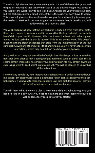 There is a high chance that you've already tried a ton of different diet plans and weight loss strategies that simply didn't lead to the desired weight loss effect or you just lost the weight only to gain it all back. Chances are you've tried your best, but the techniques simply didn't work. If this is the case, you don't have to worry. This book will give you the much-needed recipes for you to enjoy to make your diet easier to start and continue to gain the numerous health benefits you will achieve while on a low carb diet! You will be happy to know that the low carb diet is quite different from other diets. It has been proven by various scientific sources that the low carb diet is extremely beneficial to your health. However, this is not even the best part. What's great about the low carb diet is that it requires little to no excess work. This doesn't mean that there aren't challenges that arise from the implementation of the low carb diet. As with any other diet or life-changing plan, you will have to face certain restrictions, which may be a bit too much for your willpower. Are you tired of trying out every kind of weight loss diet that promises heaven but does not even offer earth? Is losing weight becoming such an uphill task that it seems almost impossible to achieve your goal weight? Are you almost giving up ever losing weight? Well, don't just give up yet. You will be pleased to know that all hope is not lost. I know many people say how important carbohydrates are, which I am not disputing. What I am disputing is taking a diet that is rich in carbs especially refined carbohydrates. If you want to learn more about a low-carb diet, this book will provide all the information you need and much more. You will learn what a low-carb diet is, how many daily carbohydrate grams you need to take in a day, what you need to eat more and what intake to reduce as well as some tasty recipes to get you started.