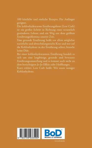 100 köstliche und einfache Rezepte. Für Anfänger geeignet.Die kohlenhydratarme Ernährungsform (Low Carb) ist ein großer Schritt in Richtung eines wesentlich gesünderen Lebens und ein Weg aus dem größten Ernährungsdilemma unserer Zeit.Eine gesunde Ernährung heißt vor allem möglichst natürliche und abwechslungsreiche Kost und wer auf die Kohlenhydrate in der Ernährung achtet, braucht keine Diät.Bei einer kohlenhydratarmen Ernährung handelt es sich um eine langfristige, gesunde und bewusste Ernährungsumstellung und es kommt auch nicht zu dem berüchtigten Jo-Jo-Effekt oder Heißhunger. Kurz erklärt: Low Carb heißt: Wir essen weniger Kohlenhydrate.