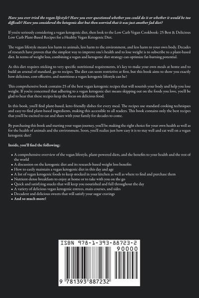 Have you ever tried the vegan lifestyle? Have you ever questioned whether you could do it or whether it would be too difficult? Have you considered the ketogenic diet but then worried that it was just another fad diet? If you're seriously considering a vegan ketogenic diet, then look to the Low Carb Vegan Cookbook: 25 Best & Delicious Low Carb Plant-Based Recipes for a Healthy Vegan Ketogenic Diet. The vegan lifestyle means less harm to animals, less harm to the environment, and less harm to your own body. Decades of research have proven that the simplest way to improve one's health and to lose weight is to subscribe to a plant-based diet. In terms of weight loss, combining a vegan and ketogenic diet strategy can optimize fat-burning potential. As this diet requires sticking to very specific nutritional requirements, it's key to make your own meals at home and to build an arsenal of standard, go-to recipes. The diet can seem restrictive at first, but this book aims to show you exactly how delicious, cost-effective, and nutritious a vegan ketogenic lifestyle can be! This comprehensive book contains 25 of the best vegan ketogenic recipes that will nourish your body and help you lose weight. If you're concerned that adhering to a vegan ketogenic diet means skipping out on the foods you love, you'll be glad to hear that these recipes keep the focus on delicious food. In this book, you'll find plant-based, keto-friendly dishes for every meal. The recipes use standard cooking techniques and easy-to-find plant-based ingredients, making this accessible to all readers. This book contains only the best recipes that you'll be excited to eat and share with your family for decades to come. By purchasing this book and starting your vegan journey, you'll be making the right choice for your own health as well as for the health of animals and the environment. Soon, you'll realize just how easy it is to stay well and eat well on a vegan ketogenic diet! Inside, you'll find the following:A comprehensive overview of the vegan lifestyle, plant-powered diets, and the benefits to your health and the rest of the world A discussion on the ketogenic diet and its research-based weight loss benefits How to easily maintain a vegan ketogenic diet in this day and age A list of vegan ketogenic foods to keep stocked in your kitchen as well as where to find and purchase them Nutrient-dense breakfasts to enjoy at home or to take with you on the go Quick and satisfying snacks that will keep you nourished and full throughout the day A variety of delicious vegan ketogenic entrees, main courses, and sides Decadent and delicious sweets that will satisfy your sugar cravings And so much more!