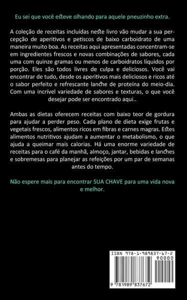 Eu sei que você esteve olhando para aquele pneuzinho extra. A coleção de receitas incluídas neste livro vão mudar a sua percepção de aperitivos e petiscos de baixo carboidrato de uma maneira muito boa. As receitas aqui apresentadas concentram-se em ingredientes frescos e novas combinações de sabores, cada uma com quinze gramas ou menos de carboidratos líquidos por porção. Eles são todos livres de culpa e deliciosos. Você vai encontrar de tudo, desde os aperitivos mais deliciosos e ricos até o sabor perfeito e refrescante lanche de proteína do meio-dia. Com uma incrível variedade de sabores e texturas, o que você desejar pode ser encontrado aqui.. Ambas as dietas oferecem receitas com baixo teor de gordura para ajudar a perder peso. Cada plano de dieta exige frutas e vegetais frescos, alimentos ricos em fibras e carnes magras. Estes alimentos nutritivos ajudam a aumentar o metabolismo, o que ajuda a queimar mais calorias. Há uma enorme variedade de receitas para o café da manhã, almoço, jantar, bebidas e lanches e sobremesas para planejar as refeições por um par de semanas antes do tempo. Não espere mais para encontrar SUA CHAVE para uma vida nova e melhor.