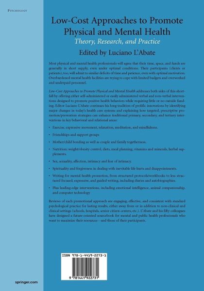 Low-Cost Approaches to Promote Physical and Mental Health addresses both sides of this shortfall by offering either self-administered or easily administered verbal and non-verbal interventions designed to promote positive health behaviors while requiring little or no outside funding. Editor Luciano L'Abate continues his long tradition of prolific innovations by identifying major changes in today's health care systems and explaining how targeted, prescriptive promotion/prevention strategies can enhance traditional primary, secondary, and tertiary interventions in key behavioral and relational areas: