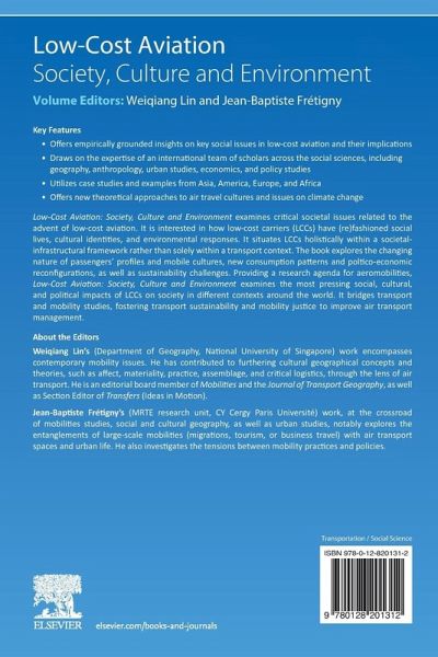 Low-Cost Aviation: Aeromobilities Culture, Politics, and Infrastructures covers critical societal issues such as labor regimes, unequal and changing flying publics, transnational dynamics of migration, tourism, business experiences, environmental challenges and shifting territorialities of LCCs at various scales. It situates LCCs holistically within a societal-infrastructural regime rather than solely within a transport context. The book explores the changing nature of passengers' profiles and mobile cultures, new consumption patterns and Economic Re-Configurations, as well as geopolitical and sustainability challenges. Providing a research agenda for aeromobilities, the book examines the most pressing social, cultural and political impacts of LCCs on society in different global contexts.