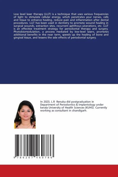 Low level laser therapy (LLLT) is a technique that uses various frequencies of light to stimulate cellular energy, which penetrates your nerves, cells and tissue to enhance healing, reduce pain and inflammation after dental procedures. LLLT has been used in dentistry to promote wound healing in surgical wounds, extraction sites, recurrent aphthous ulcerations, etc. LLLT is an effective treatment strategy for periodontal therapy and surgery. Photobiomodulation, a process mediated by low-level lasers, promotes additional benefits in the near term, speeds up the healing of bone and gingival tissue, and lessens the side effects of periodontal surgery.