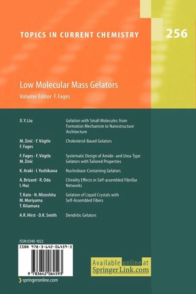 X.Y. Liu: Gelation with Small Molecules: from Formation Mechanism to Nanostructure Architecture.- M. Zinic, F. Vögtle, F. Fages: Cholesterol-Based Gelators.- F. Fages, F. Vögtle, M. Zinic: Systematic Design of Amide- and Urea-Type Gelators with Tailored Properties.- K. Araki, I. Yoshikawa: Nucleobase-Containing Gelators.- A. Brizard, R. Oda, I. Huc: Chirality Effects in Self-Assembled Fibrillar Networks.- T. Kato, N. Mizoshita, M. Moriyama, T. Kitamura: Gelation of Liquid Crystals with Self-Assembled Fibers.- A. Hirst, D. K. Smith: Dendritic Gelators.