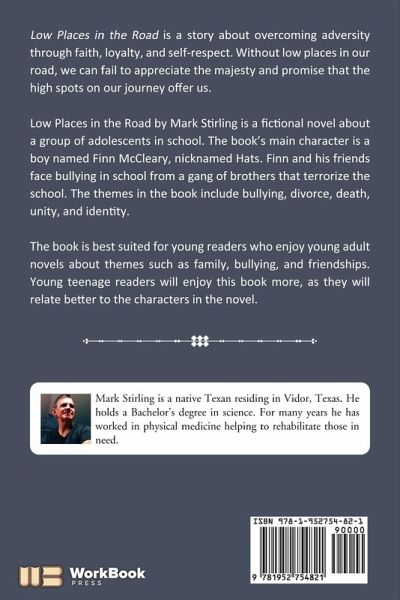 Low Places in the Road is a story about overcoming adversity through faith, loyalty, and self-respect. Without low places in our road, we can fail to appreciate the majesty and promise that the high spots on our journey offer us. Low Places in the Road by Mark Stirling is a fictional novel about a group of adolescents in school. The book's main character is a boy named Finn McCleary, nicknamed Hats. Finn and his friends face bullying in school from a gang of brothers that terrorize the school. The themes in the book include bullying, divorce, death, unity, and identity. The book is best suited for young readers who enjoy young adult novels about themes such as family, bullying, and friendships. Young teenage readers will enjoy this book more, as they will relate better to the characters in the novel.