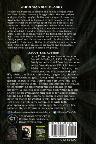 JOHN WAS NOT FLASHY. He kept his business to himself and held his tongue while his friend Bobby constantly bragged about the new gadgets and gear that he bought. Bobby was the type of person that lived in the moment and seemed to have no concern at all whether or not the money he spent was the best use of his resources. After all, in the past any time he found himself running short on something, there was always someone else around to lend a hand or bail him out. So, when disaster came, Bobby once again relied on his friend John to save the day. Only John began to realize that there was no end to Bobby's greed and his decisions would ruin them both if he allowed it. Fortunately, Bobby didn't really know what John had. After all, when resources are scarce and the masses come for them, its good to keep a low profile.