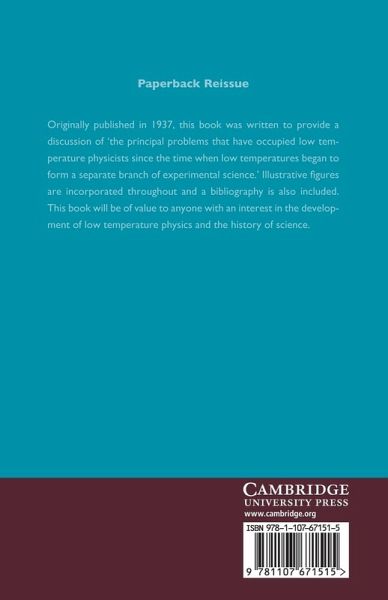 Originally published in 1937, this book was written to provide a discussion of 'the principal problems that have occupied low temperature physicists since the time when low temperatures began to form a separate branch of experimental science'. Illustrative figures are incorporated throughout and a bibliography is also included. This book will be of value to anyone with an interest in the development of low temperature physics and the history of science.