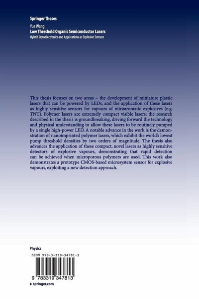 This thesis focuses on two areas - the development of miniature plastic lasers that can be powered by LEDs, and the application of these lasers as highly sensitive sensors for vapours of nitroaromatic explosives (e.g. TNT). Polymer lasers are extremely compact visible lasers; the research described in the thesis is groundbreaking, driving forward the technology and physical understanding to allow these lasers to be routinely pumped by a single high-power LED. A notable advance in the work is the demonstration of nanoimprinted polymer lasers, which exhibit the world's lowest pump threshold…mehr