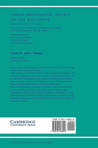 This is the first unified treatment in book form of the lower K-groups of Bass and the lower L-groups of the author. These groups arise as the Grothendieck groups of modules and quadratic forms which are components of the K- and L-groups of polynomial extensions. They are important in the topology of non-compact manifolds such as Euclidean spaces, being the value groups for Whitehead torsion, the Siebemann end obstruction and the Wall finiteness and surgery obstructions. Some of the applications to topology are included, such as the obstruction theories for splitting homotopy equivalences and for fibering compact manifolds over the circle. Only elementary algebraic constructions are used, which are always motivated by topology. The material is accessible to a wide mathematical audience, especially graduate students and research workers in topology and algebra.