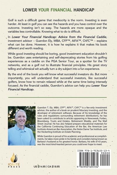Golf is such a difficult game that mediocrity is the norm. Investing is even harder. At least in golf you can see the hazards and you have control over the outcome. Investing isn't so easy. The hazards are more opaque and the variables less controllable. Knowing what to do is difficult. In Lower Your Financial Handicap: Advice from the Financial Caddie, investment advisor -- Guerdon Ely, MBA, CFP¿, AIFA¿, ChFC¿ -- explains what can be done. However, it is how he explains it that makes his book different and worth reading. While good investing should be boring, good investment education shouldn't be. Guerdon uses entertaining and self-deprecating stories from his golfing experiences as a caddie on the PGA Senior Tour, as a spotter for the TV networks, and as a golf nut to illustrate financial principles. His great story telling and whimsical wit actually turn a dry subject into a fun experience. By the end of the book you will know what successful investors do. But more importantly, you will understand that successful investors, like successful golfers, know how to remain relaxed while at the same time being intensely focused. As the financial caddie, Guerdon's advice can help you Lower Your Financial Handicap.