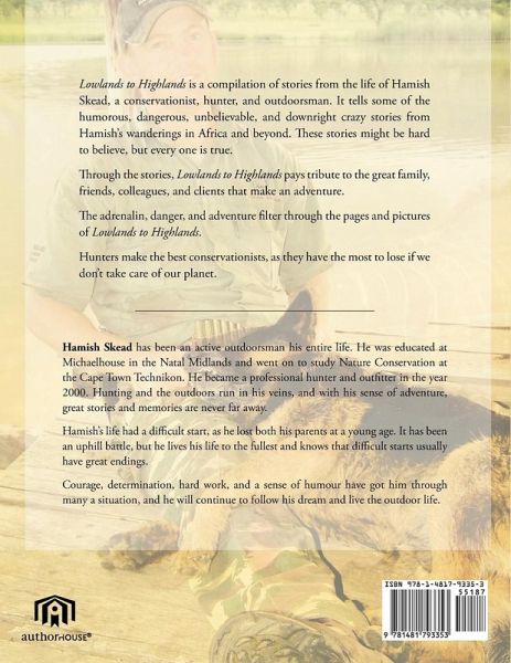 Lowlands to Highlands is a compilation of stories from the life of Hamish Skead, a conservationist, hunter, and outdoorsman. It tells some of the humorous, dangerous, unbelievable, and downright crazy stories from Hamish's wanderings in Africa and beyond. These stories might be hard to believe, but every one is true. Through the stories, Lowlands to Highlands pays tribute to the great family, friends, colleagues, and clients that make an adventure. The adrenalin, danger, and adventure filter through the pages and pictures of Lowlands to Highlands. Hunters make the best conservationists, as they have the most to lose if we don't take care of our planet.