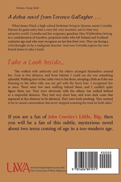 Fiction. When James Ward, a high- school freshman living in Queens, meets Cornelia Parsons he gains entry into a very old, very secretive, and to him very attractive world. Cornelia and her enigmatic guardian Miss Widdershins belong to a confederation of travelers, perpetual exiles who left Ireland and Scotland centuries ago and who now recognize no law but their own. They are facing a crisis brought on by a malignant deserter. And now Cornelia expects her new friend James to take a hand. Fans of John Crowley's Little, Big will be fans of this subtle, mysterious novel about two teens coming of age in a too-modern age. The story is highly engaging, with a varied array of nostalgic touches from different countries and periods...The various players are quietly but richly delineated, and their conversations ring true; James and Cornelia's relationship is particularly strong. Indeed, the plot often takes a back seat to character development and exploration of the travelers' secret world. This is a welcome choice, however, as Gallagher often handles it deftly.--Kirkus Reviews
