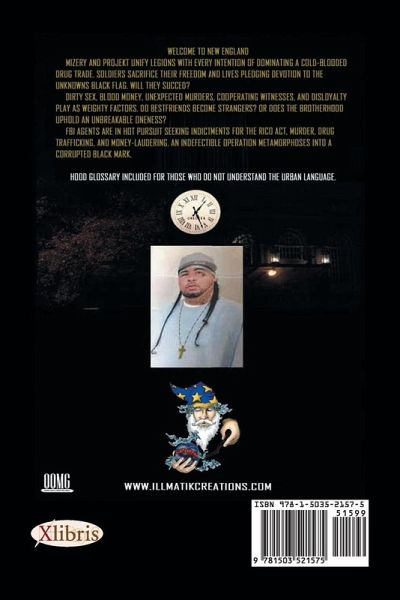 WELCOME TO NEW ENGLAND MIZERY AND PROJEKT UNIFY LEGIONS WITH EVERY INTENTION OF DOMINATING A COLD- BLOODED DRUG TRADE. SOLDIERS SACRIFICE THEIR FREEDOM AND LIVES PLEDGING DEVOTION TO THE UNKNOWNS BLACK FLAG. WILL THEY SUCCED? DIRTY SEX, BLOOD MONEY, UNEXPECTED MURDERS, COOPERATING WITNESSES, AND DISLOYALTY PLAY AS WEIGHTY FACTORS. DO BESTFRIENDS BECOME STRANGERS? OR DOES THE BROTHERHOOD UPHOLD AN UNBREAKABLE ONENESS? FBI AGENTS ARE IN HOT PURSUIT SEEKING INDICTMENTS FOR THE RICO ACT, MURDER, DRUG TRAFFICKING, AND MONEY- LAUDERING. AND INDEFECTIBLE OPERATION METAMORPHOSES INTO A CORRUPTED BLACK MARK.