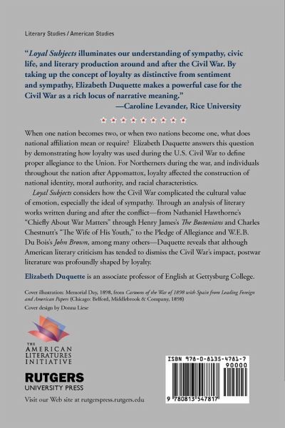 When one nation becomes two, or when two nations become one, what does national affiliation mean or require? Elizabeth Duquette answers this question by demonstrating how loyalty was used during the U.S. Civil War to define proper allegiance to the Union. For Northerners during the war, and individuals throughout the nation after Appomattox, loyalty affected the construction of national identity, moral authority, and racial characteristics. Loyal Subjects considers how the Civil War complicated the cultural value of emotion, especially the ideal of sympathy. Through an analysis of literary works written during and after the conflict-from Nathaniel Hawthorne's "Chiefly About War Matters" through Henry James's The Bostonians and Charles Chestnutt's "The Wife of His Youth," to the Pledge of Allegiance and W.E.B. Du Bois's John Brown, among many others-Duquette reveals that although American literary criticism has tended to dismiss the Civil War's impact, postwar literature was profoundly shaped by loyalty.
