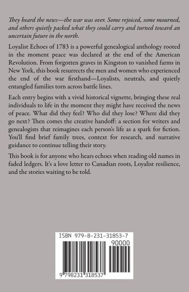 They heard the news-the war was over. Some rejoiced, some mourned, and others quietly packed what they could carry and turned toward an uncertain future in the north. Loyalist Echoes of 1783 is a powerful genealogical anthology rooted in the moment peace was declared at the end of the American Revolution. From forgotten graves in Kingston to vanished farms in New York, this book resurrects the men and women who experienced the end of the war firsthand-Loyalists, neutrals, and quietly entangled families torn across battle lines. Each entry begins with a vivid historical vignette-bringing these real individuals to life in the moment they might have received the news of peace. What did they feel? Who did they lose? Where did they go next? Then comes the creative handoff: a section for writers and genealogists that reimagines each person's life as a spark for fiction. You'll find brief family trees, context for research, and narrative guidance to continue telling their story. This book is for anyone who hears echoes when reading old names in faded ledgers. It's a love letter to Canadian roots, Loyalist resilience, and the stories waiting to be told.
