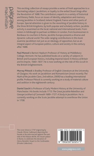 PAUL MONOD is Barton Hepburn Professor of History at Middlebury College, Vermont. He has published books on a variety of subjects in British and European history, including Imperial Island: A History of Britain and its Empire, 1660-1837. He is now working on the role of the occult in the British Enlightenment. MURRAY PITTOCK is Bradley Professor of English Literature at the University of Glasgow. His work on Jacobitism and Romanticism (most recently The Myth of the Jacobite Clans, 2nd edition, 2009) has a leading edge international profile. Professor Pittock is currently working on a study of material culture and sedition in the eighteenth century. DANIEL SZECHI is Professor of Early Modern History at the University of Manchester. His books include: 1715. The Great Jacobite Rebellion and George Lockhart of Carnwath 1689-1727: a Study in Jacobitism. He is currently working on the Scots Jacobite attempt to overthrow the Union in 1708.