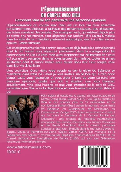 L'Épanouissement du couple avec Dieu est un livre tiré d'un ensemble d'enseignements bibliques à l'adresse des personnes seules, des célibataires, des futurs mariés et des couples. Ces enseignements, qui existent depuis plus de trente ans maintenant, sont dispensés par l'apôtre Félix Baleta Simakala dans le cadre de son ministère pastoral et apostolique, avec le soutien de son épouse ; Josée Simakala. Ces enseignements visent à donner aux couples déjà établis les connaissances dont ils ont besoin pour s'épanouir pleinement dans leur mariage selon les ordonnances de Dieu le Père, mais aussi d'apporter aux célibataires et à ceux qui souhaitent s'engager dans les voies sacrées du mariage, toutes les armes spirituelles dont ils auront besoin pour réussir dans leur futur couple, voire dans leur vie de solitaire. Vous souhaitez réussir dans votre couple et voir la gloire du Seigneur se manifester dans votre vie? Alors je vous invite à lire ce livre qui, à n'en point douter, saura vous ressourcer et vous aider à faire de votre conjoint une personne épanouie, quelle que soit la situation que vous traversez actuellement. Ainsi, peu importe ce que vous attendez de la part de Dieu, considérez que Dieu vous l'a déjà donné, et vous le verrez s'accomplir. (Marc 11: 24)