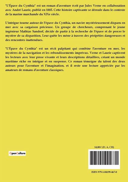 "L'Épave du Cynthia" est un roman d'aventure coécrit par Jules Verne et André Laurie, qui nous plonge dans une quête palpitante à travers les mers glacées de l'Arctique. L'histoire débute avec l'ami de M. Malarius, qui découvre des indices menant à l'épave du navire Cynthia. Le récit suit les péripéties d'un groupe de personnages, dont maaster Hersebom et Erik, qui se lancent dans une expédition pour élucider les mystères entourant cette épave. Au fil des chapitres, les protagonistes traversent divers paysages, de Noroë à Stockholm, et rencontrent des personnages intrigants tels que Patrick O'Donoghan et Tudor Brown, esquire. L'intrigue se complexifie avec l'apparition de récompenses alléchantes et de lettres mystérieuses, intitulées La Vëga. Les tensions montent alors que des coups de canon et de fusil retentissent, mettant en péril la sécurité des aventuriers. Finalement, le périple atteint son apogée avec la découverte de secrets enfouis et la résolution des énigmes qui entourent l'épave. Le roman se conclut par une lettre de Paris et une réflexion sur les découvertes faites au Val-Féray, offrant une conclusion satisfaisante à cette aventure maritime.