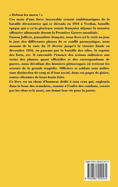 Debout les morts ! Ces mots d'une force incroyable restent emblématiques de la bataille dévastatrice qui se déroula en 1916 à Verdun, bataille épique qui a vu la glorieuse armée française déjouer la massive offensive allemande durant la Première Guerre mondiale. Gaston Jollivet, journaliste français, nous livre ici le récit au jour le jour des différentes phases de ce conflit paroxystique, nous menant de la ruée du 21 février jusqu'à la victoire finale en décembre 1916, en passant par la bataille des ailes, la reprise des forts, etc. Il entremêle l'énoncé des actions militaires aux écrits des plumes quasi officielles et des correspondants de guerre, nous dévoilant des histoires pittoresques où revivent les acteurs de la grande tragédie. Officiers et soldats sont mêlés, sans distinction de rang ni d'état social, dans ces pages de gloire, toutes vibrantes de leurs hauts faits.Ce livre est un chant d'honneur dédié à tous ceux qui, engloutis dans la boue des tranchées, soumis à l'enfer des combats, cernés par les obus et la mort, ont donné leur vie pour la patrie.